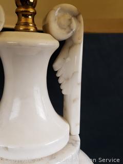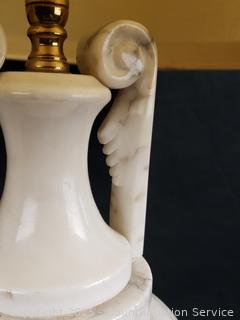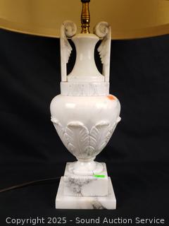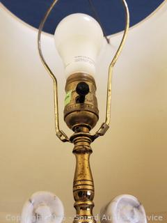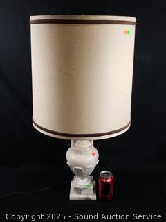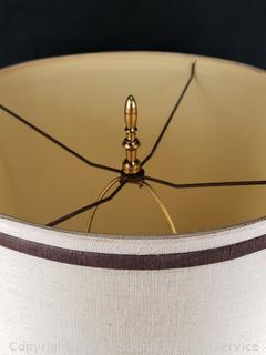 Appears to be functioning as intended. 3-way switch. Decorative pieces that look like handles are loose. 30.5" H x 15" Dia.