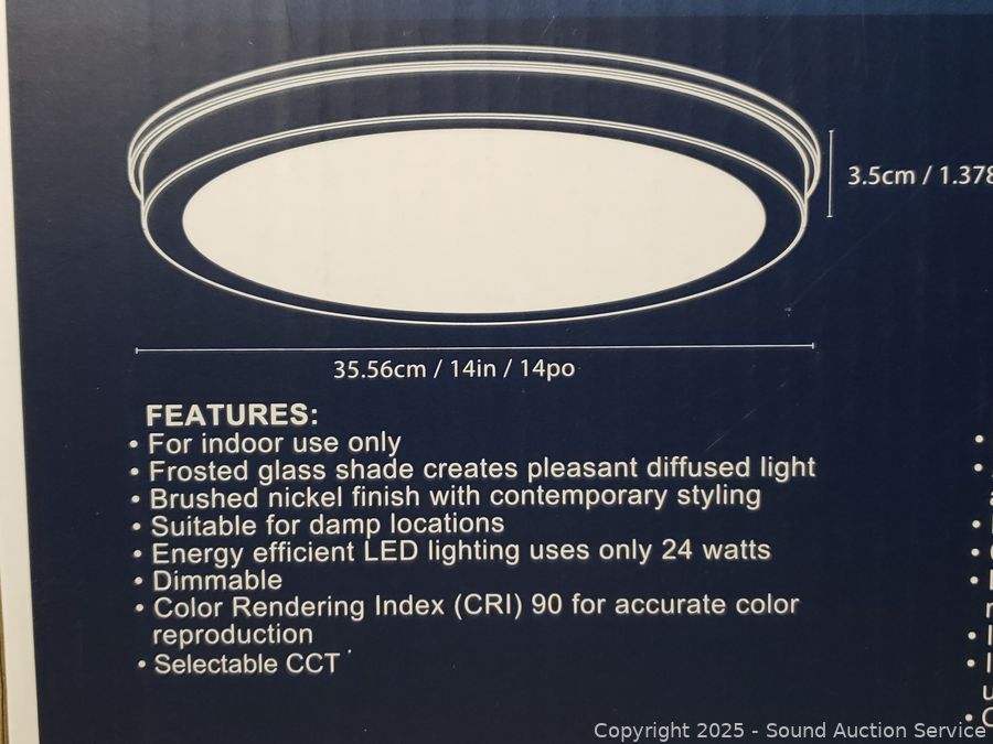 Frosted glass lens, brushed nickel finish, integrated LED's. 24W x 1560LM, 3000-5000K color.