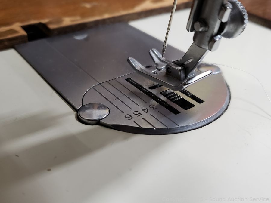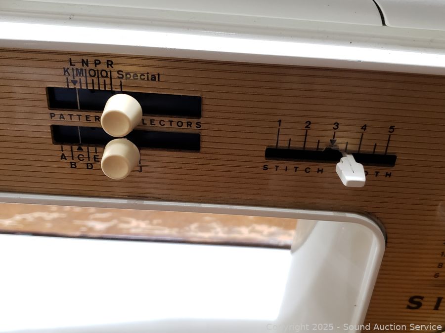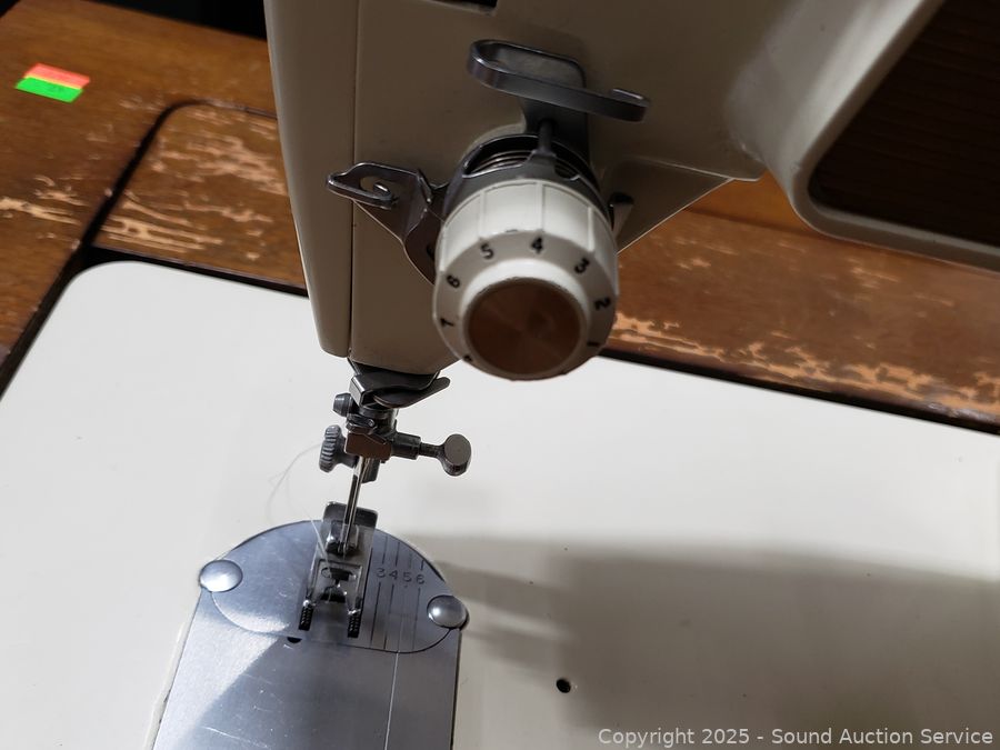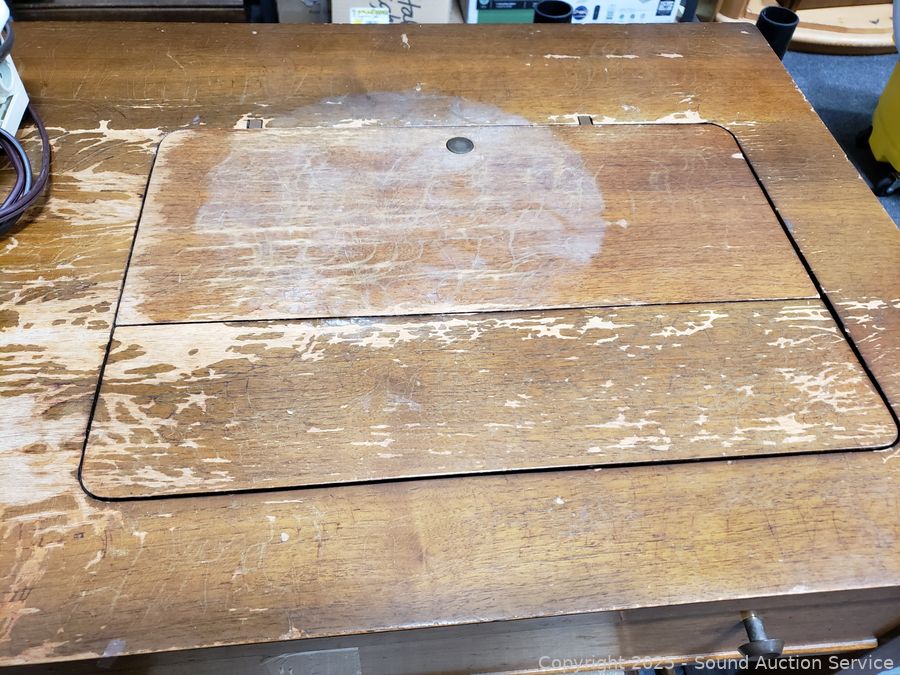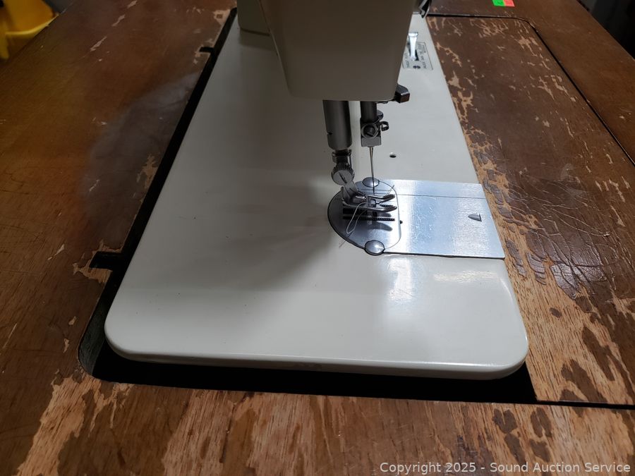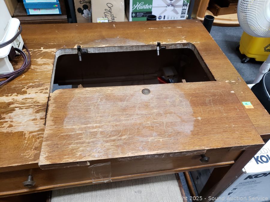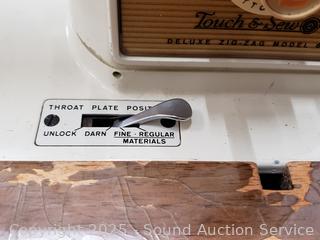 Sewing Touch & Sew Model 635 machine works. Various wear to cabinet. Some bobbins, needles, zig-zag accessories. 31" H x 43.5" W x 20" D.