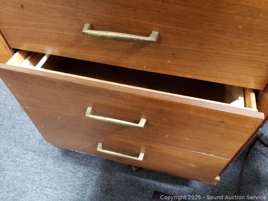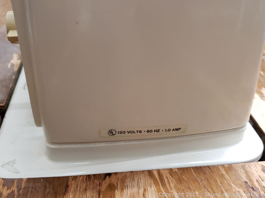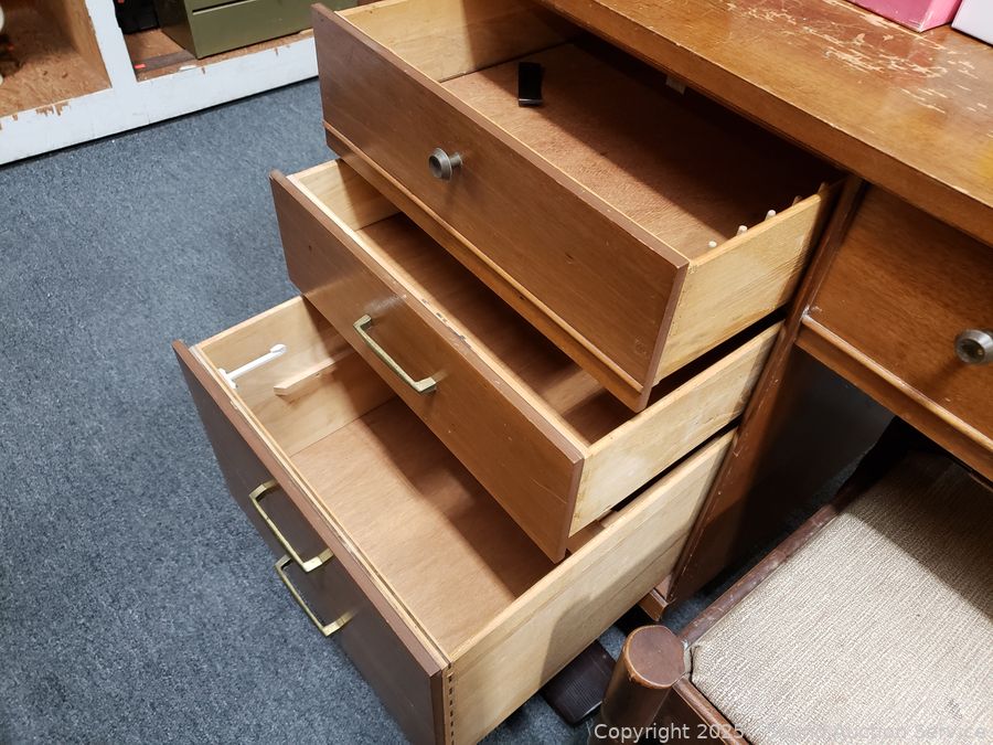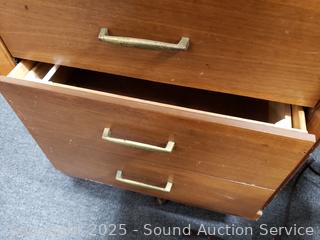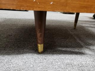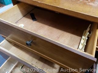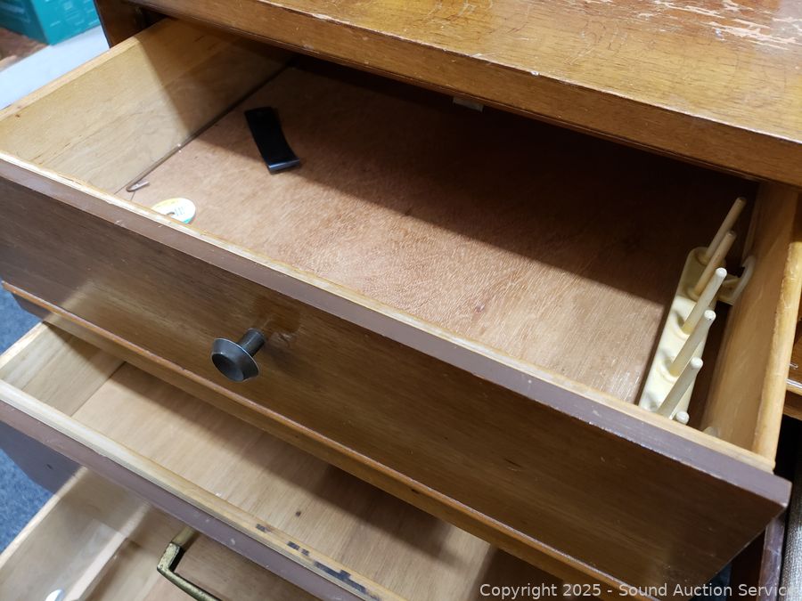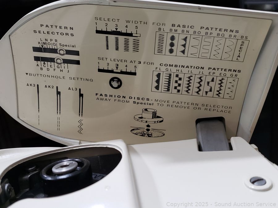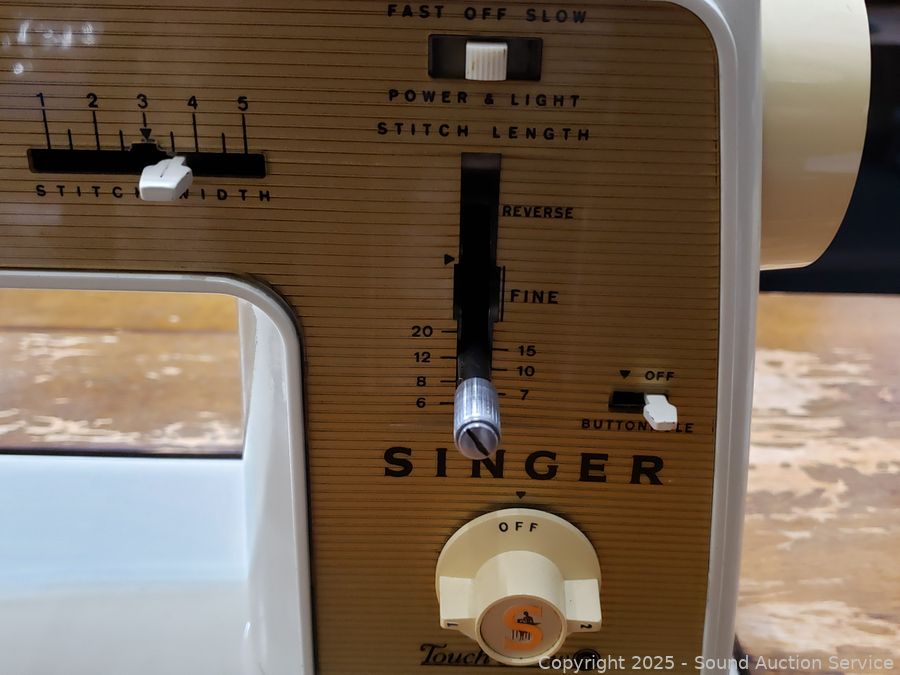 Sewing Touch & Sew Model 635 machine works. Various wear to cabinet. Some bobbins, needles, zig-zag accessories. 31" H x 43.5" W x 20" D.