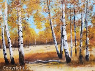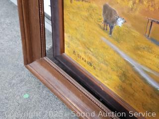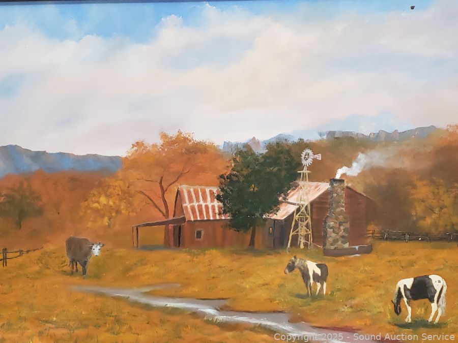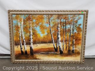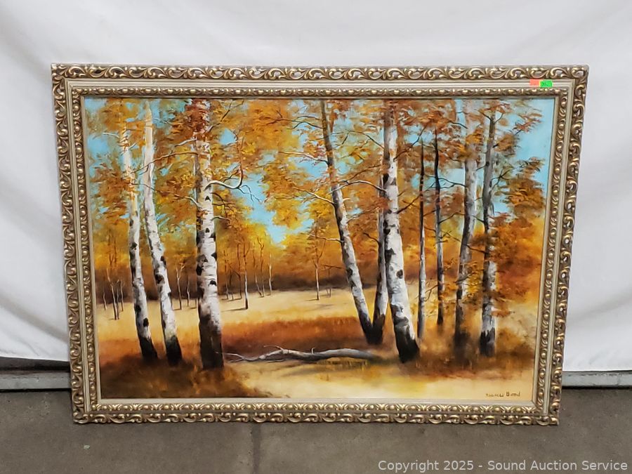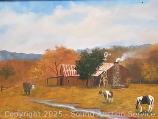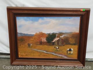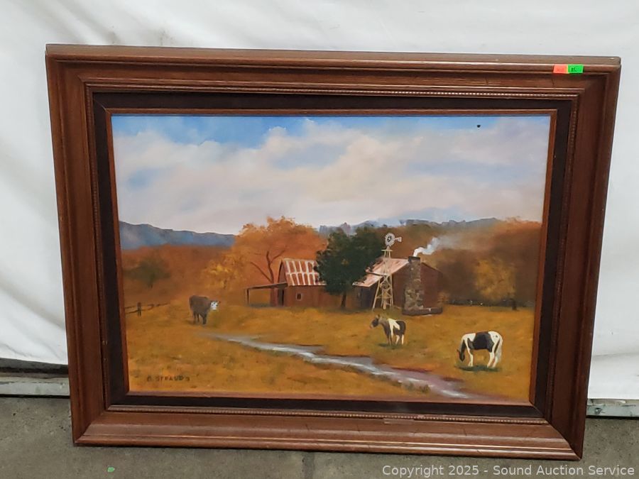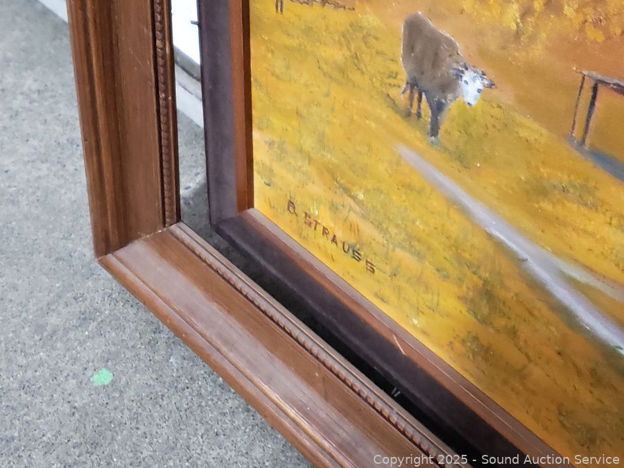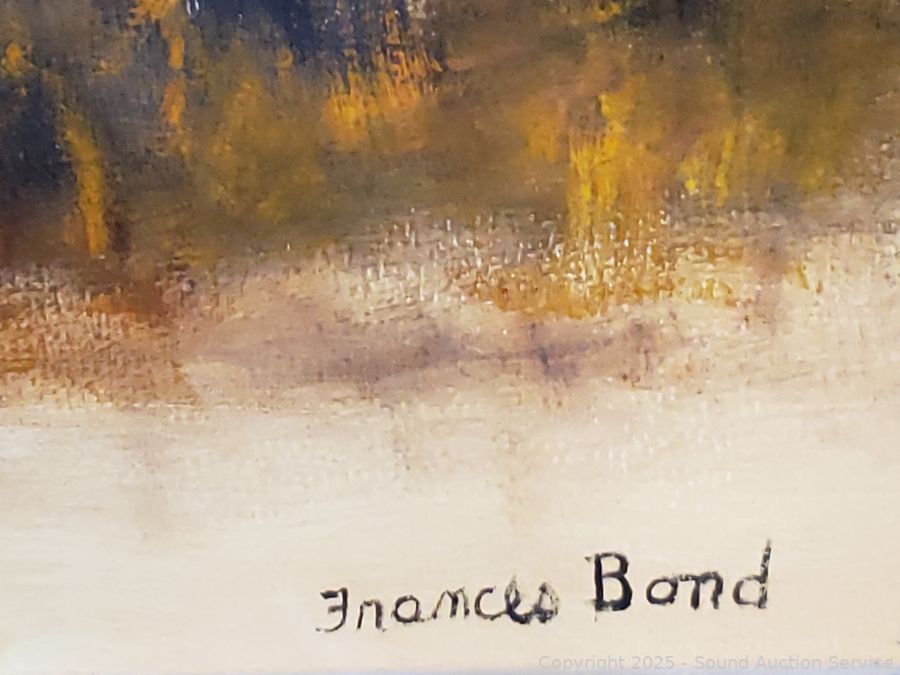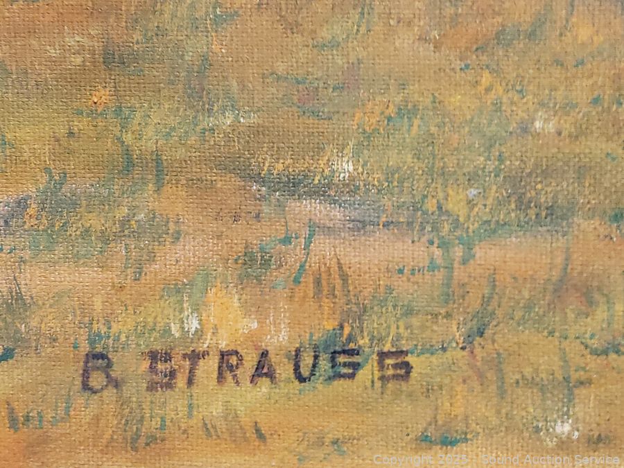 Frances Bond signed Autumn forest with ornate carved frame, 25.5" x 33". B. Strauss Farm House painting, 24" x 29.5".