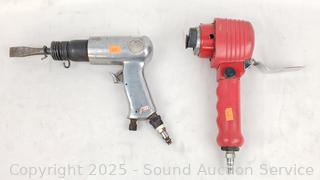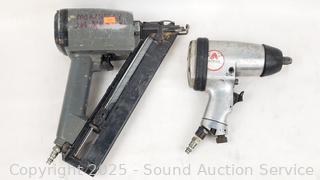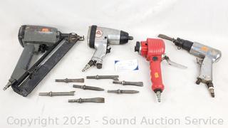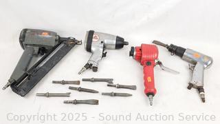 Senco Nailer, All-Trade 1/2" Impact Driver, Rodac Dual Action Sander, Air Chisel Hammer. All with wear from use. Red unit is leaking air, non-functioning, the rest appear to be functioning as intended.
