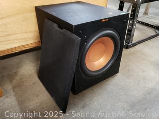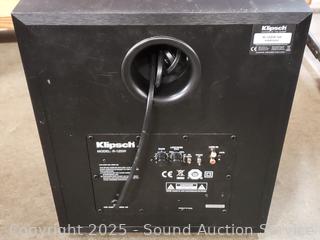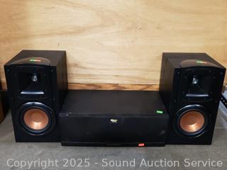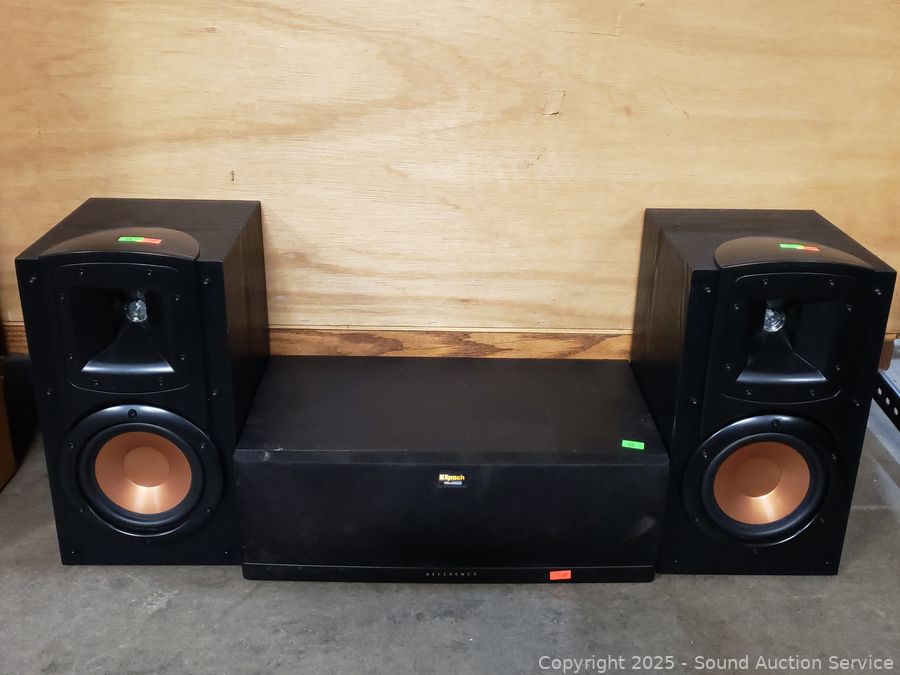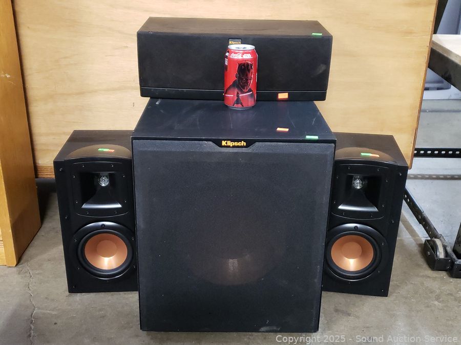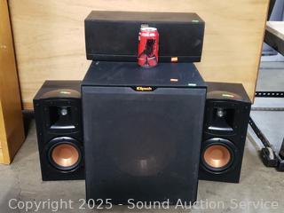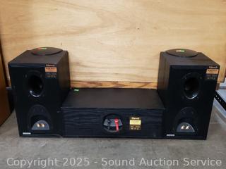 2 Bookcase speakers B-200, 1 center speaker RC-42-II, 12" subwoofer. All appear to be functioning as intended. No grills for bookcase speakers, grill for sub not quite fitting properly.