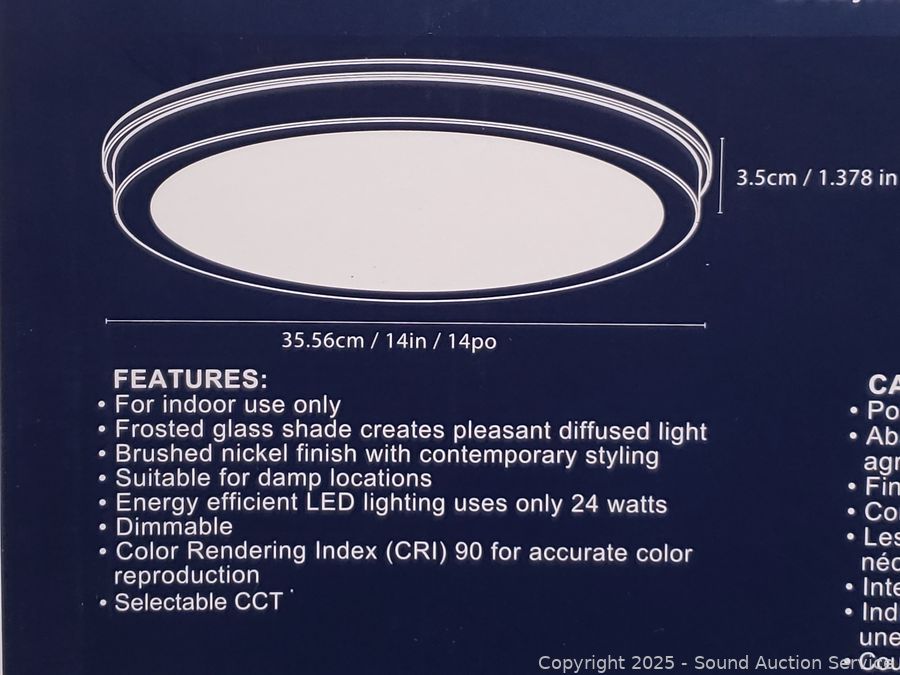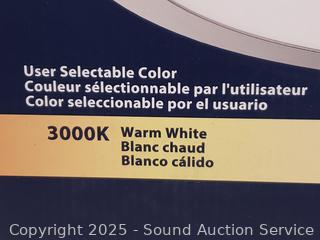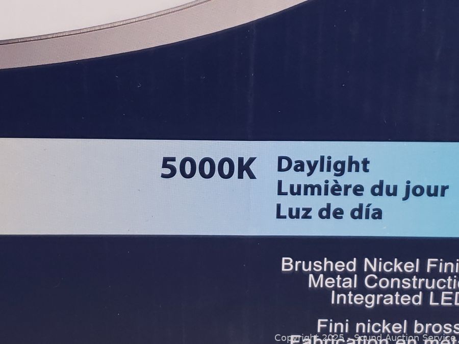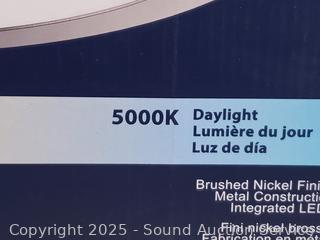 24W, 1560LM, 3000-5000K color. Brushed nickel finish, frosted glass lens, integrated LED's. 1-3/8" x 14".