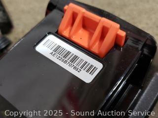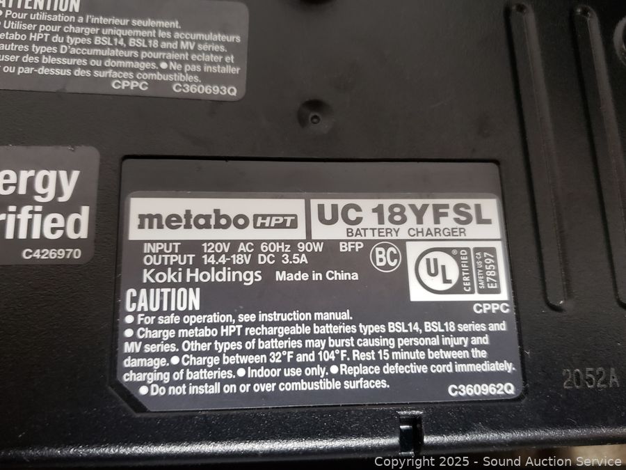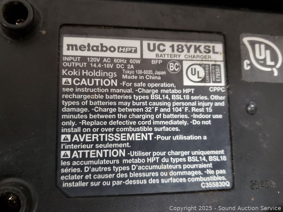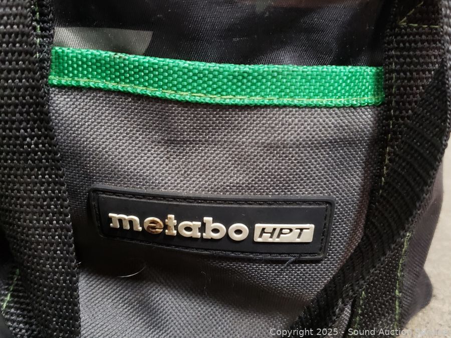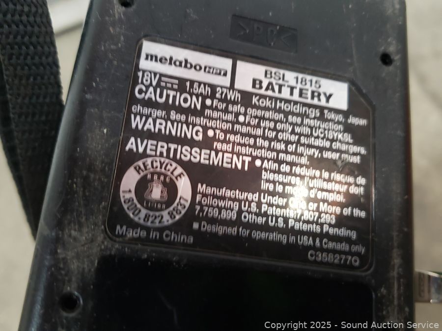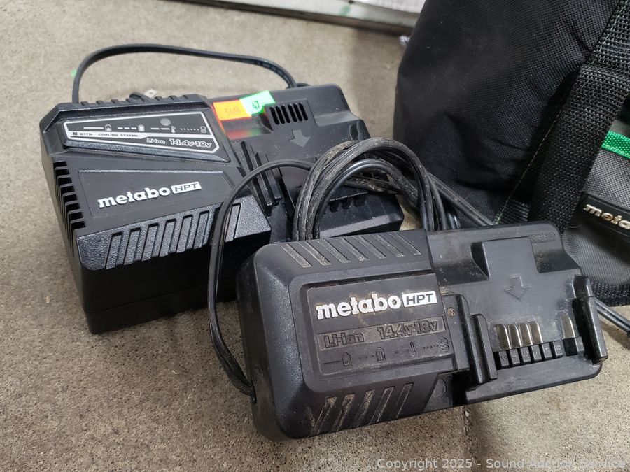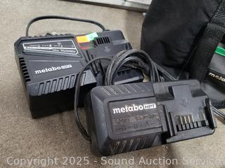 Metabo comes with tote bag, charger, battery. Black & Decker comes with battery & charger. All work. Signs of wear from use.
