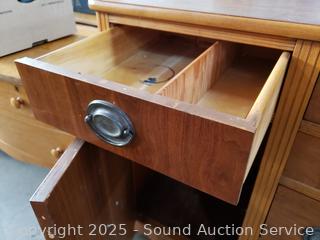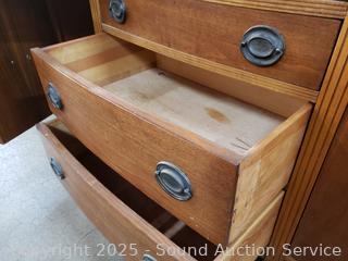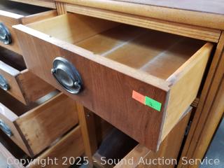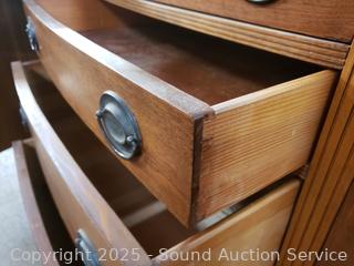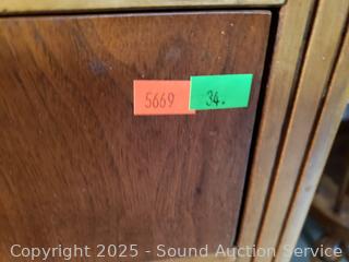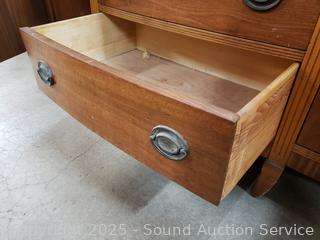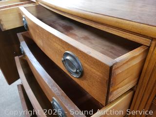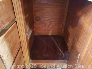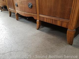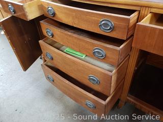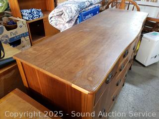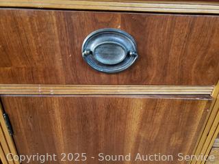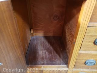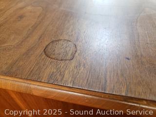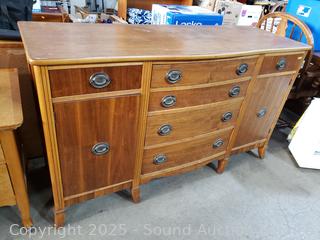 Some scuffs, wear to finish, large stain wear spot on the top. Appears to be all wood construction. 35.5" H x 60" W x 21" D.