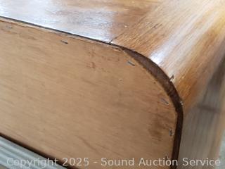 Some scuffs, scratches in finish. Roller drawer guides. Appears to be all wood construction. 35.5" H x 66" W x 18" D.