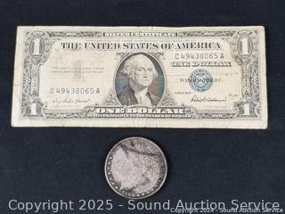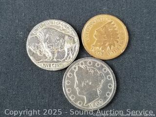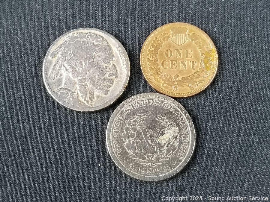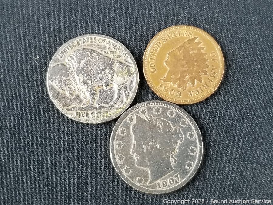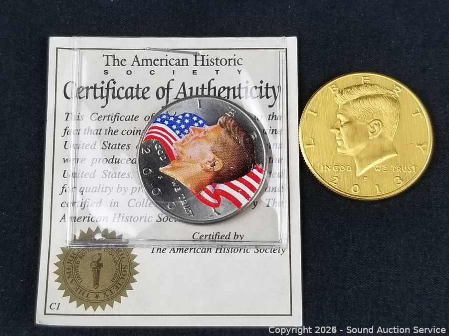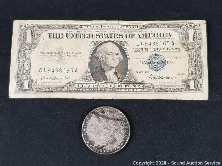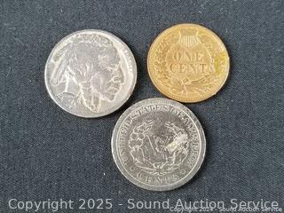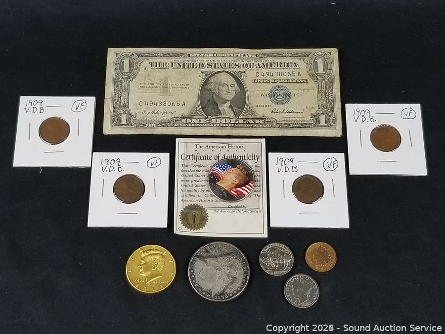 1888 Carson City Morgan dollar replica (Morgan dollar did not test silver, weight was off, according to research online Carson City did not mint Morgan dollars in 1888. Bid at your own risk, we are not experts). (4) 1909 VDB Lincoln Cents, Golden 2013 Kennedy Half $1, Painted 2000 Kennedy Half $1 w/CoA, 1903 Indian Head Cent, 1907 Victory Nickel, Buffalo Nickel, 1957 $1 Silver Certificate. ATTN: We are not coin or currency experts or graders, please use your own judgement when bidding.