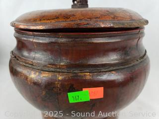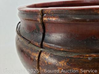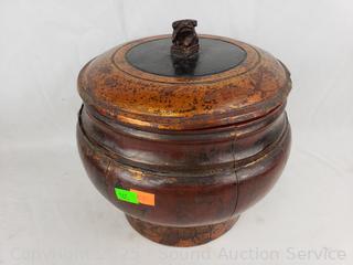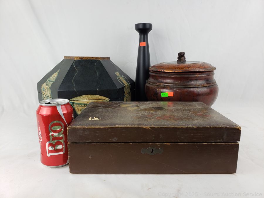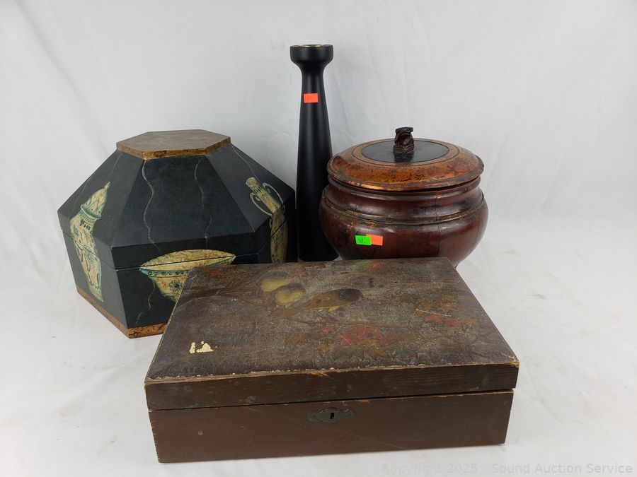 Round one has some loose panels. Medium size one has a broken hinge, is painted pink and has loose panels inside. Approx. 3.5" to 8.5" H x 8.5" to 11.5" W/Dia.
