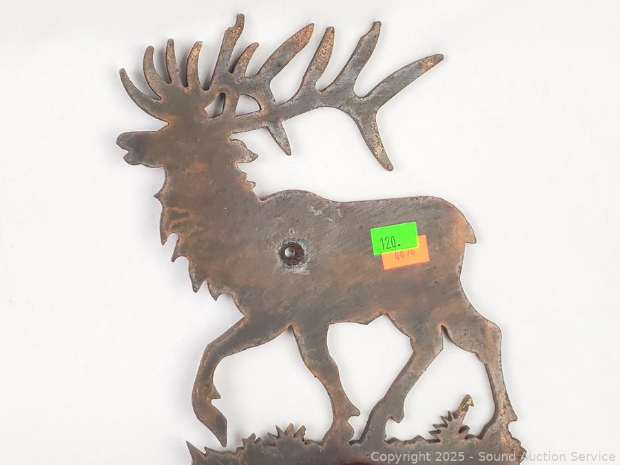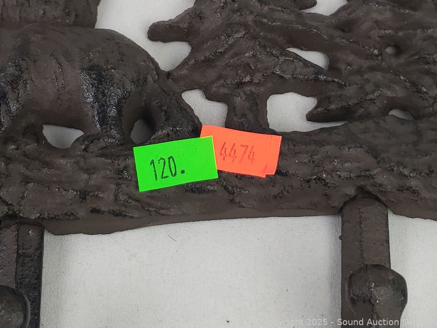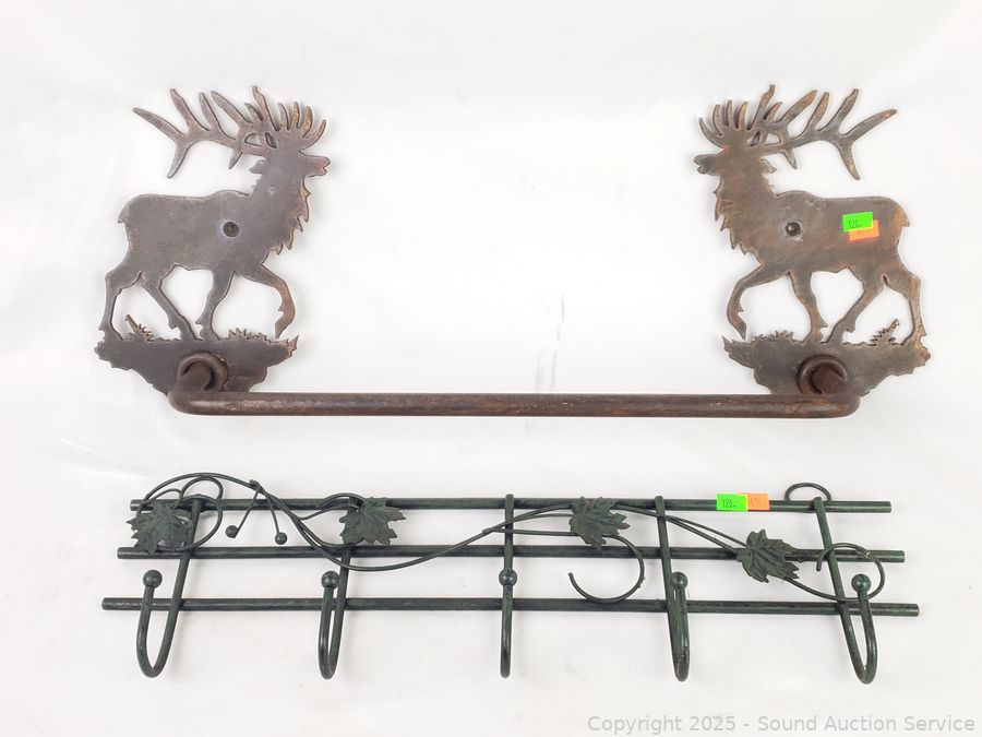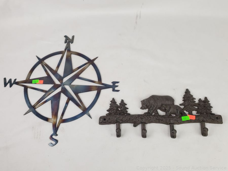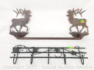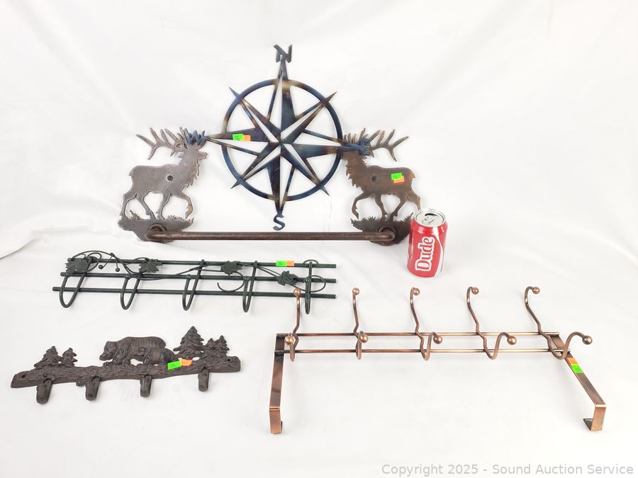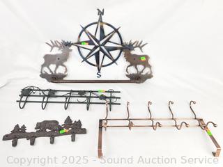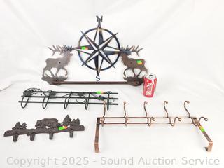 Lot #0120: 3 Coat/Hat Racks, Iron Elk Towel Bar, Metal Art Compass