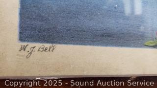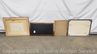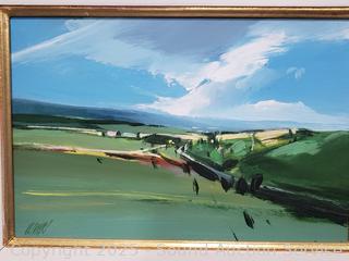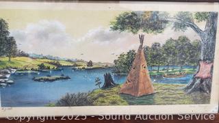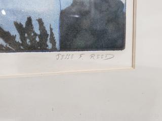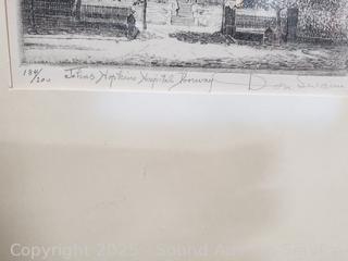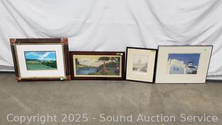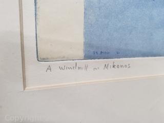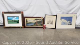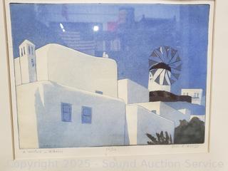 Limited Don Swann signed 180/300 John's Hopkins Hospital sketch, 14.75" x 11.75". W.G.Bell "Lone Camp" Artwork, 12" x 22". Jesse F. Reed signed "A Windmill on Mikonos" #ED/20, 16" x 20". Signed original Abstract Landscape painting, 17.75" x 22.75".