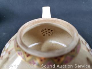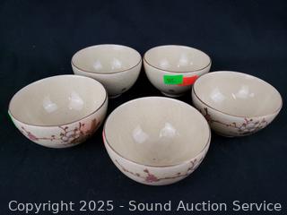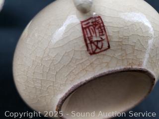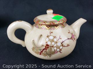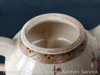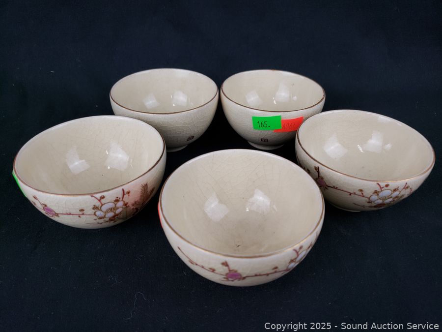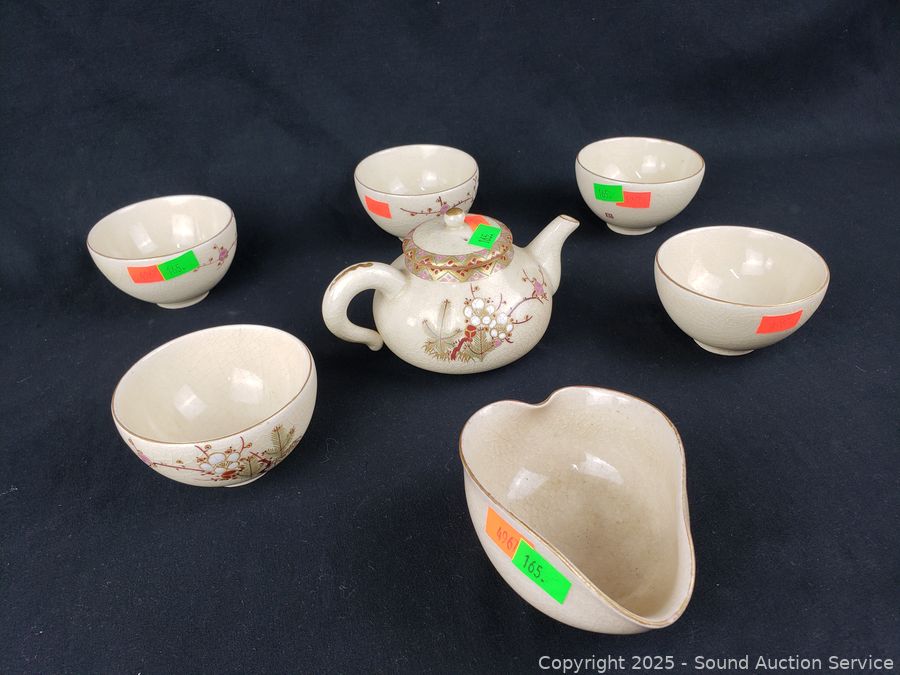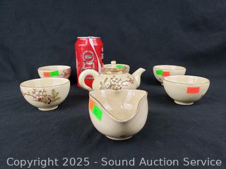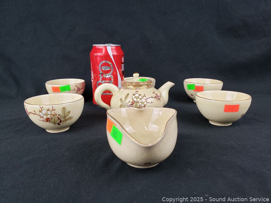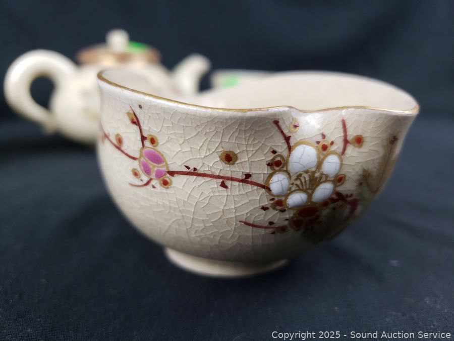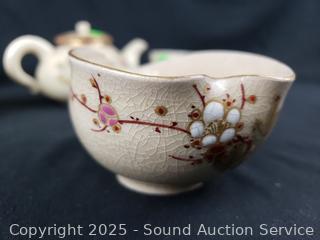 5 cups, sugar dish, miniature teapot. Various crazing.