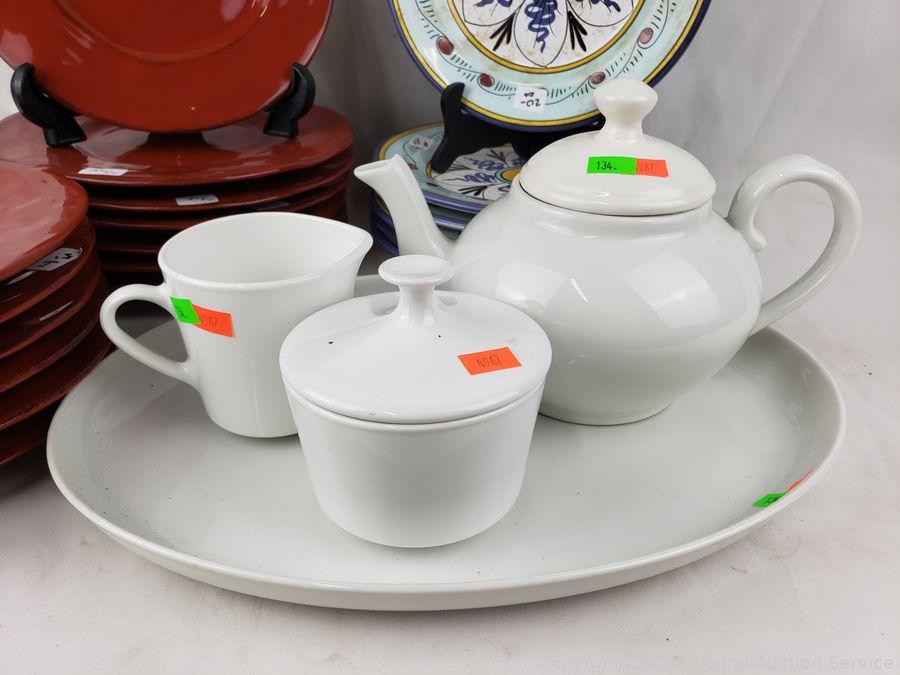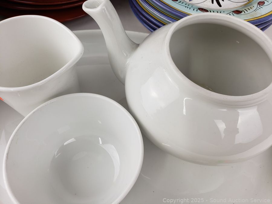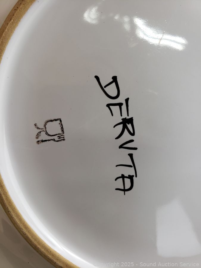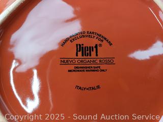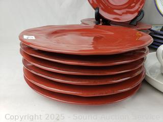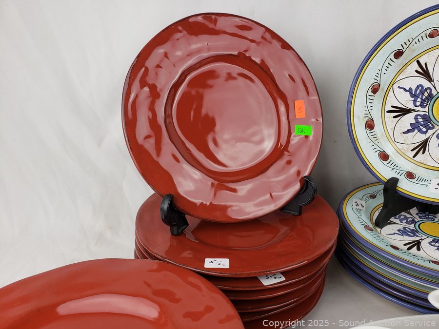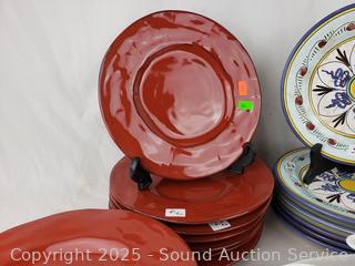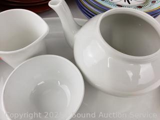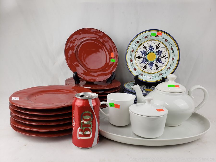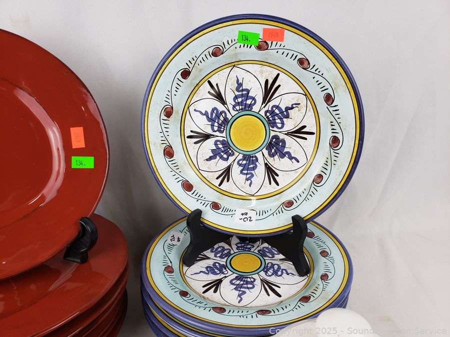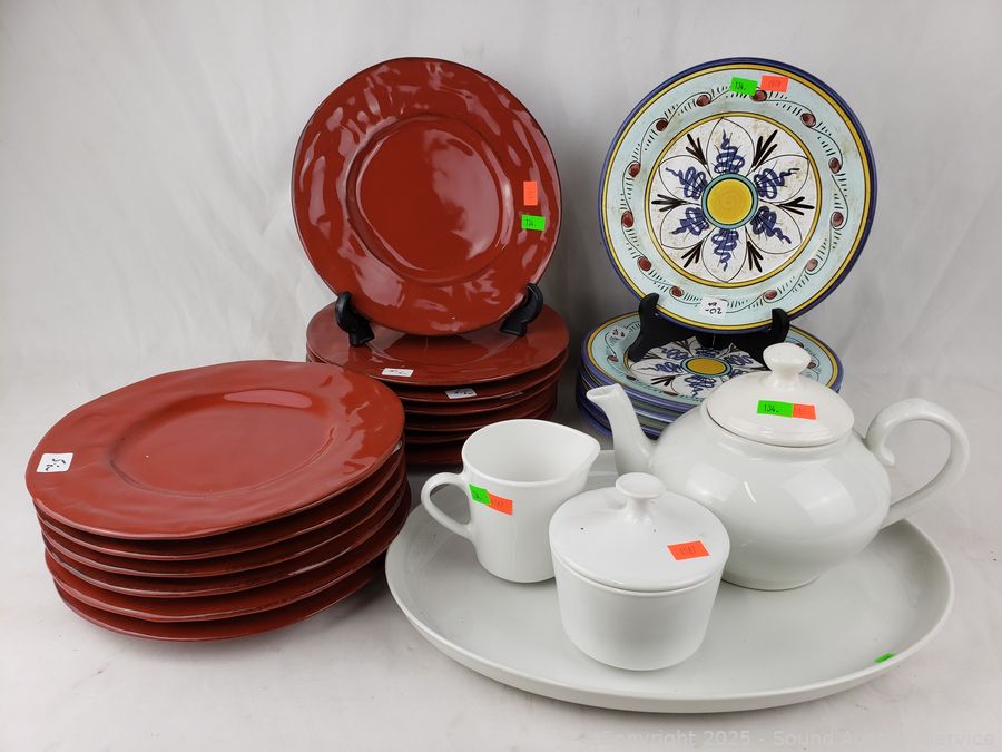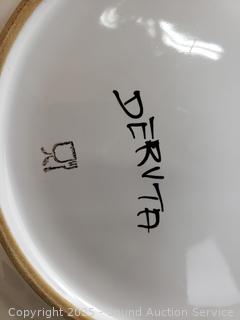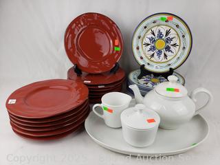6 Dervta signed hand painted 8.75" plates. 12 Pier-1 9" plates. Centura Tea Set.