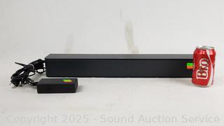 Model 418775. Has power, tested with AUX into phone, volume is very low, no remote to adjust or choose inputs. 2.75" H x 21-5/8" W x 3.25" D.