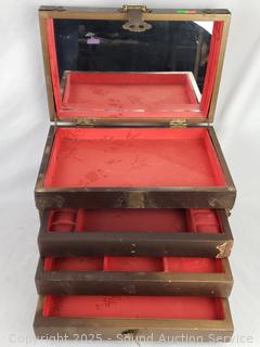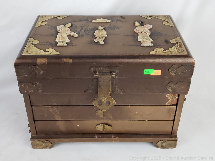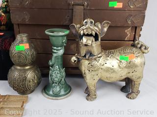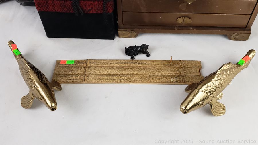 Jewelry chest (some damage on the front), 10.25" H x 14" W x 9" D. Cast Brass Foo Dog, Cast Gold Koi fish, painted mirrors, chalk sculpture (various wear, chips, dings). Refer to photos for lot contents, more details.