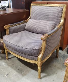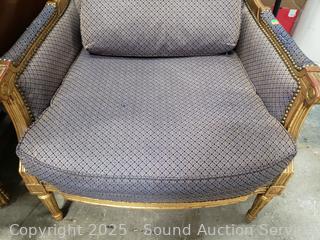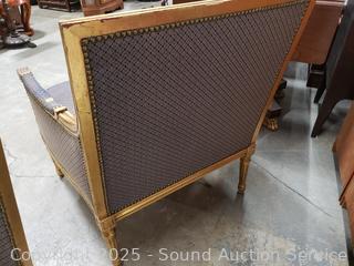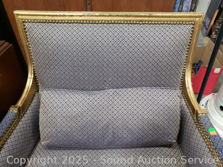 Comes with matching lumbar pillow. Some wear to gilded finish & fabric on armrests. 34.5" H x 30" W x 18" to seat. Matches the previous lot.
