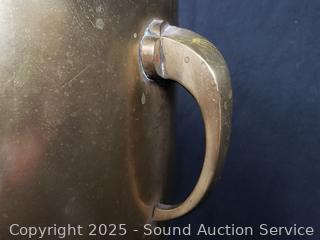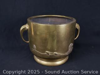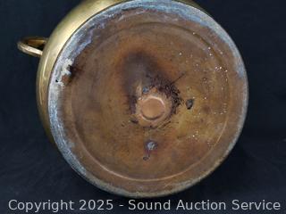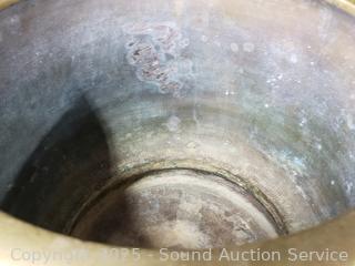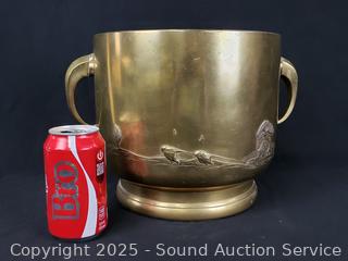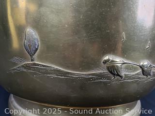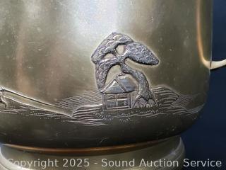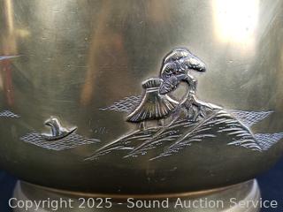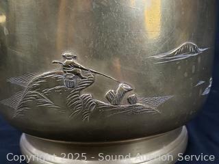 9" H x 10" Dia. Don't see any major issues. Embossed oriental scene.