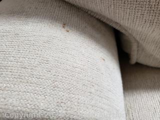 Don't see any major issues. Comes with arm covers, could use a proper wash. Matches the previous lot. 30" H x 41" W x 19" to seat.