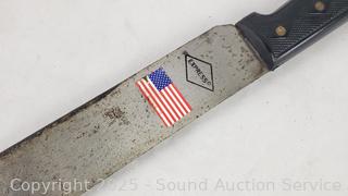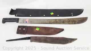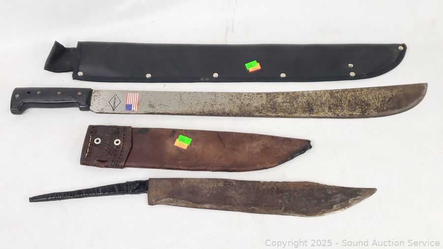 Bowie knife 19.5" length, 13" blade, various wear, some damage to blade. Expresso Machete 27" length, 22" blade, signs of wear from use, nylon sheathe.