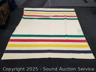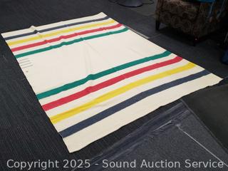 Has 4 stripes signifying it costs 4 beaver pelts. Approx. 90" x 72". Don't see any tags, makers marks.