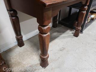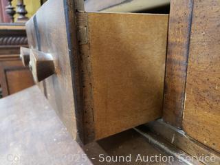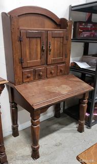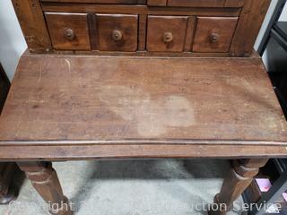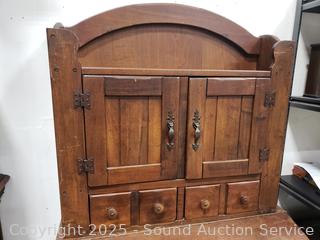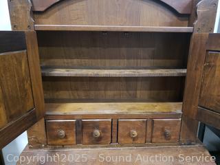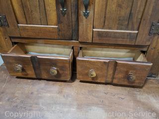 Olde patina finish, scuffs, scratches in finish, all wood construction. 68" H x 40" W x 26.25" D.
