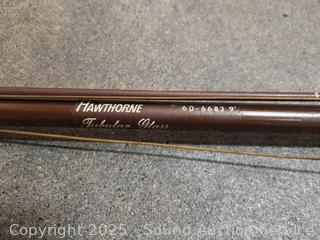 King Fisher 6.5ft rod with DAM Quick 330 Reel, Hawthorne 9ft fly rod w/reel, Diawa 6.5ft rod w/DAM Quick 330 reel, Sportfisher rod is broken, comes with Ocean Side 307 reel. Various wear from use, refer to photos for more details.