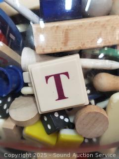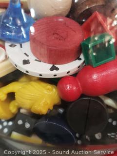 Full poker chips, dominoes, scrabble pieces, dice, chess pieces, etc. Missing the locking mechanism for the top, lid just sitting there. 38" H x 7.5" Dia.