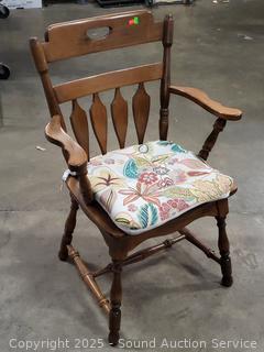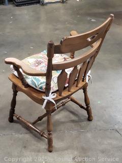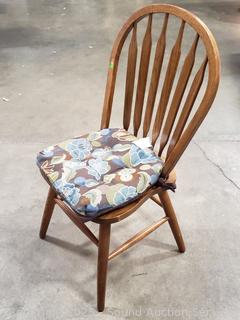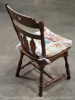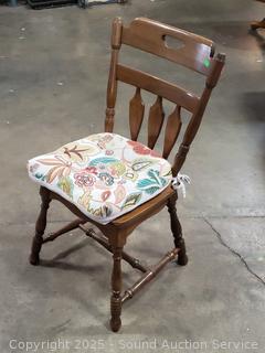2 chairs are different, oak slat back. (2) leaves 11.5" W. 30" H x 47.5" Dia. table. All with tie-on chair pads.