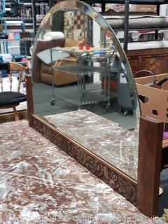 Hand beveled mirror with carved accents, single drawer, side cabinets with carved accents in the doors. 56.5" H x 48.75" W x 18.5" D. Some wear from age, use, overall good condition. Appears to be all wood construction.