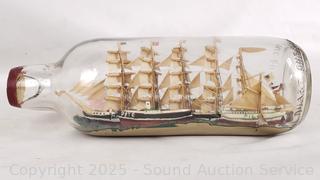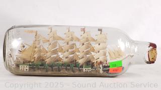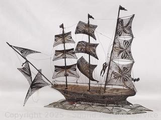 Ship in a glass bottle 10" x 3.5", large chip on the mouth of the bottle. Matel art filigree ship, 8.5" H x 10" L. Steel door stop, bronze emblem, 21" x 14". Porcelain Tile trivets.