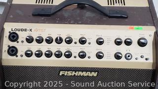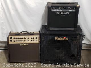 All have power, otherwise untested, various wear from use. Roland KC-100, Fishman Loudbox Artist, Behringer GM108. 12.5" H x 13.5" x 6.25" D & 16.5" H x 19" W x 11" D.