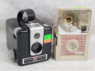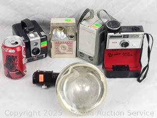 Anscoflex II, Kodak Instamatic 154 Camera, Kodak Hawkeye Flash Fun, Brownie Hawkeye Flash, Kodalite Flashholder. Unknown condition, untested.