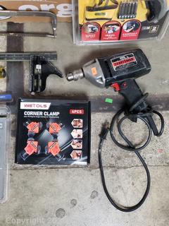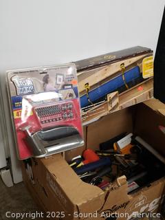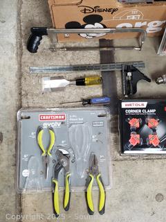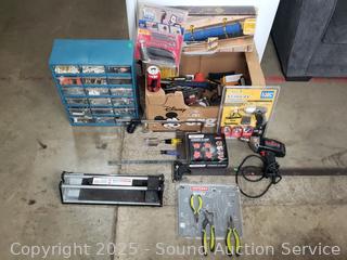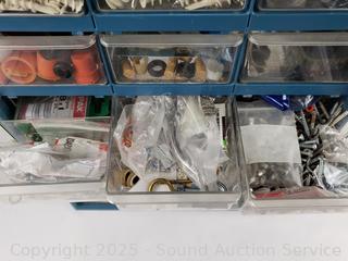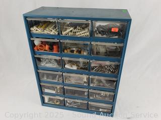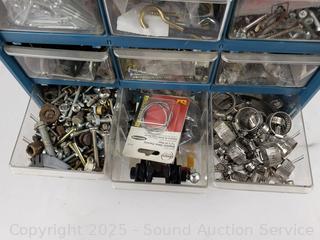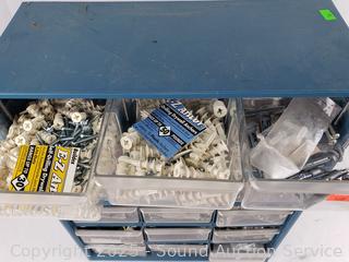 18.25" H x 14.25" W x 6.25" D hardware organizer full of hardware, overhead bulk storage kit, elec. drill, hacksaw, insta hang kit, corner clamp kit, cordless screwdriver kit, pliers kit, etc. Refer to photos for lot contents, more details.
