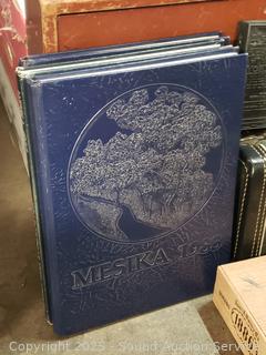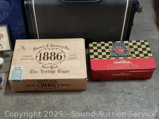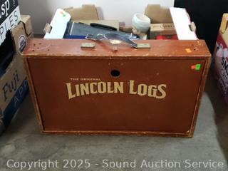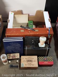 N-Scale train car, year books, cigar box, cedar trinket box, tins, wood Lincoln logs box, ink block stamp, Seattle Worlds Fair glass & more, refer to photos for lot contents, more details.