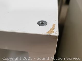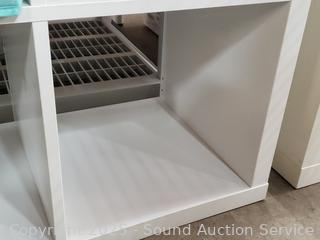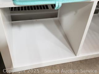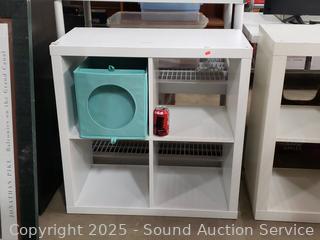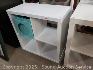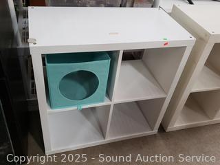 Lot #0112: White Laminate 4-Cubby Shelving Unit w/ 1 Fabric Drawer