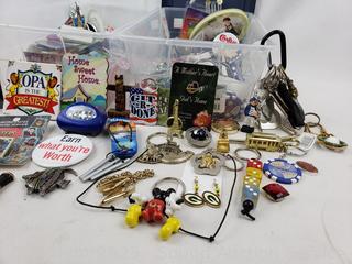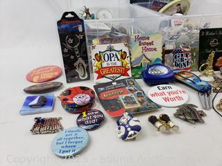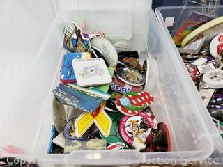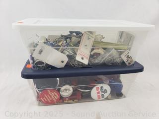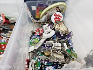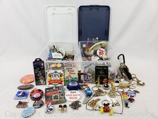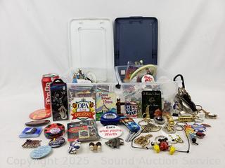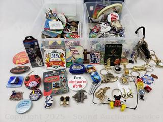Lot #0134: 2 Small Totes w/Assorted Buttons, Keychains, Trinkets