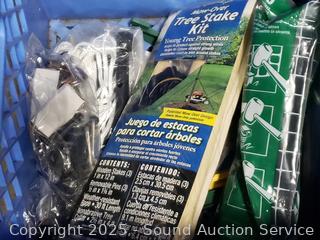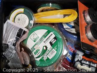 Propane brush torch head, string trimmer line, tree stakes, rope/cordage. Refer to photos for lot contents.