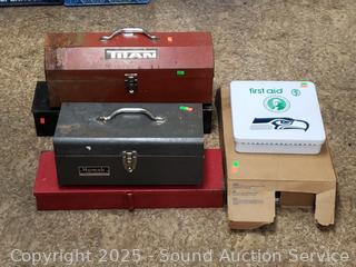 Lot #0298: 4 Empty Steel Toolboxes, First Aid Kit, Bradley Towel Dispenser