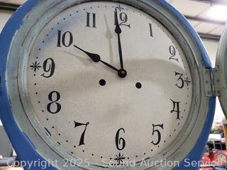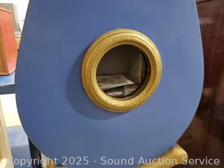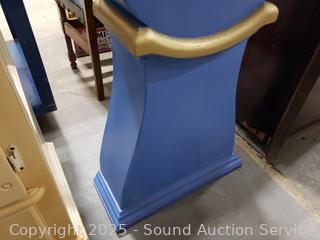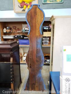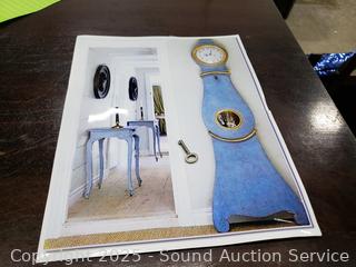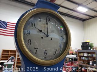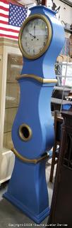 Blue & gold painted, wood construction. Clock works, quartz movement. 81.5" H x 18" W x 9" D.