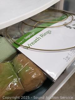 Wreath rings, foam, moss, ornaments, paints, sleeves, paper, markers, pens, crayons. 46.5" H x 21.75" W x 15.25" D.