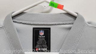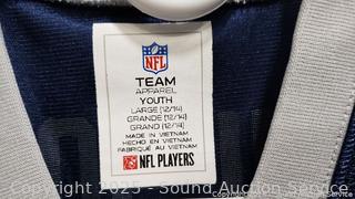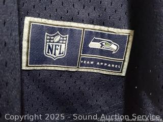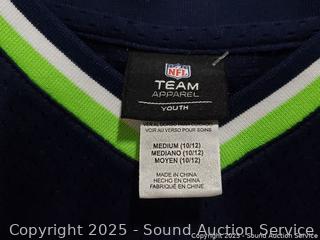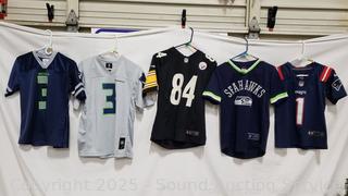 3 Seattle Seahawks Youth (2) S:L, (1) S:M, Patriots Women's? S:S, Steelers S:L. Some wear from use.