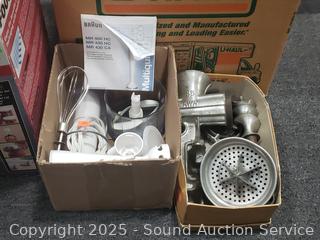 Foodsaver is missing piece that holds the bag in place, unable to test. Braun mixer. Ramekin, 8-Cup measuring cup, mixing bowl, etc. Refer to photos for lot contents, more details.
