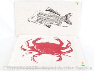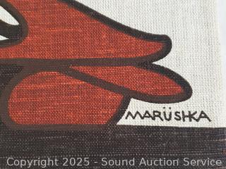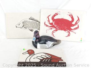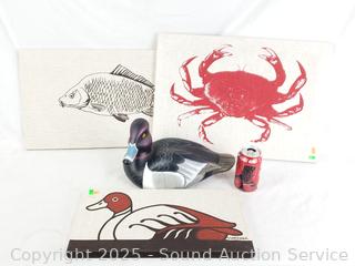 7" H x 12.5" x 7.5" duck, has a chip on bill. 2 Marüshka signed artwork, crab don't see a signature, 8" to 22" W/L.