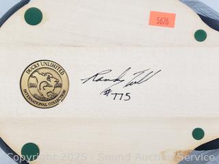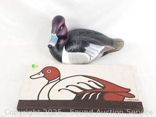 Lot #0307: Signed Painted Carved Wood Ducks Unlimited Sculpture & 3pc Burlap Print Artwork