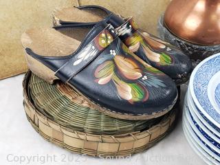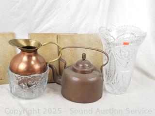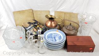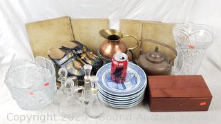Hollie wood loafers, copper teapot, copper pitcher, decanters, cruets, cedar trinket box, woven basket, etc.