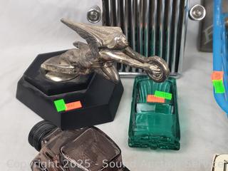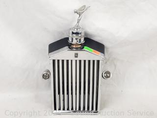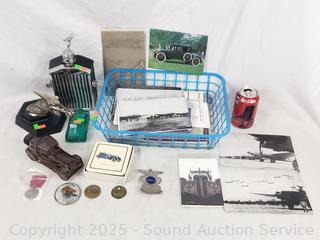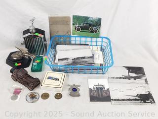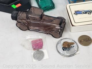 Packard ornament, Rolls Royce grill musical decanter, perfume bottles, badge, ephemera, etc. Refer to photos for lot contents, more details.