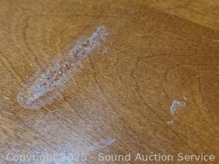 Some scuffs, wear to finish. 30" H x 30" W x 18.5" D. Appears to be all wood construction.