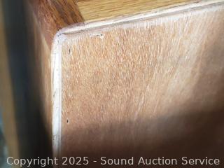 Appears to be all wood construction. Adjustable shelf. 25" H x 35.25" W x 12.75" D.