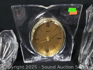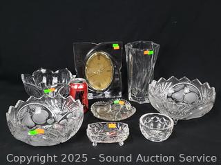 Mikasa clock, non-functioning, corrosion in battery housing. Vase, footed dish, bowls, etc. Refer to photos for more details.