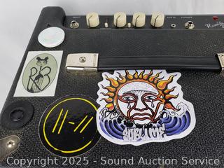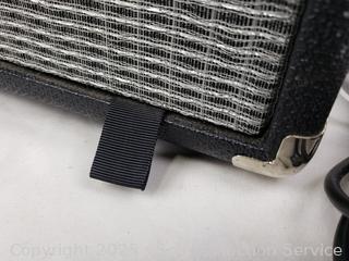 Has power, tested instrument input, knobs, buttons, all appear to be functioning as intended. Aux in headphones out is untested. Comes cosmetic wear from use, stickers. 16" H x 15.5" W x 11" D.